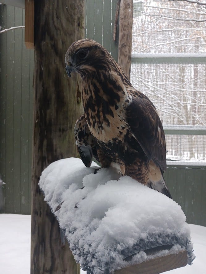 The raptors in care at the nature center can be put into two categories: the first are actively being rehabilitated from injuries sustained in the wild, and they will be released back into the wild as soon as they are ready. For many of these patients, the kinds of injuries they are recovering from may hinder their hunting ability, and so we test them to make sure they can still catch live prey. A Broad-winged Hawk with serious head trauma is put in a special outdoor enclosure, and a black or brown mouse is released into the enclosure with it. The hawk either catches and eats the mouse or doesn’t. Pass or fail.